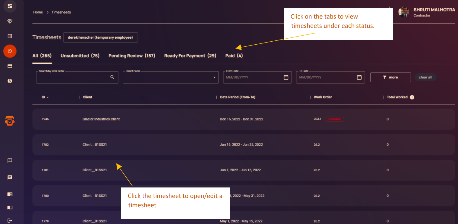 If you have been set up to enter timesheets directly into the Contractor Portal, then you should see them within the ‘Unsubmitted’ tab in the ‘Timesheets’ section. Once the timesheet is submitted, then it will be moved to the 'Pending Review' tab. You will know once it is approved when it appears in the 'Ready for Payment' tab.